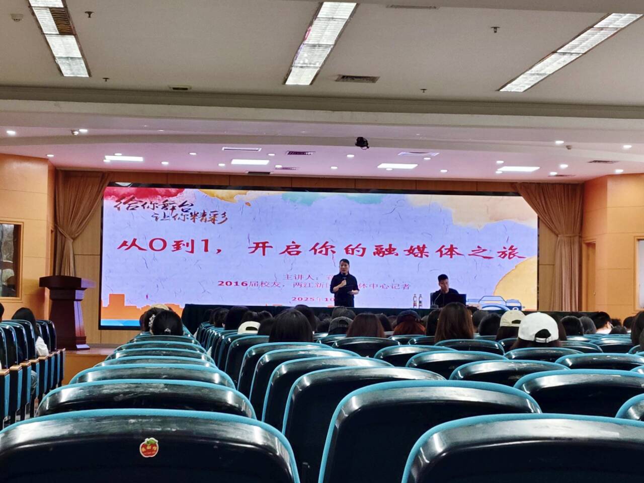 蒋锐结合自身从“初识专业”到“深耕行业”的成长经历,分享了在融媒体内容创作、技术应用与职业发展方面的宝贵经验。从入学初期的专业迷茫,到在实践中找到方向;从在校级电视台的实习历练,到大四顺利获得全职岗位,他以“一步一个脚印”的踏实经历,生动诠释了如何实现从“0”到“1”的跨越,为在场同学指明了方向,注入了信心。
